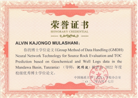 ALVIN K. MULASHANI博士学位论文题目为:“Group Method of Data Handling (GMDH) Neural Network Technology for Source Rock Evaluation and TOC Prediction based on Geochemical and Well Logs data in the Mandawa Basin, Tanzania”。论文基于大量实测地球化学数据和测井数据,利用数据分组处理方法对坦桑尼亚东南部曼达瓦盆地的三叠纪-侏罗纪Mihambia,Nondwa和Mbuo三套烃源岩进行了总有机碳(TOC)预测和评价。通过研究,论文建立了预测总有机碳(TOC)的数据分组处理广义结构(g-GMDH)的神经网络预测模型和改进的Levenberg-Marquardt增强分组数据处理算法,提高了预测的精度,具有很好的适用性和应用价值。
