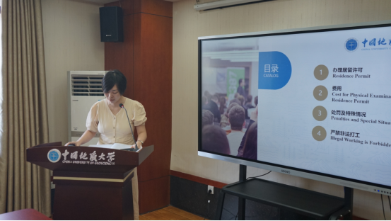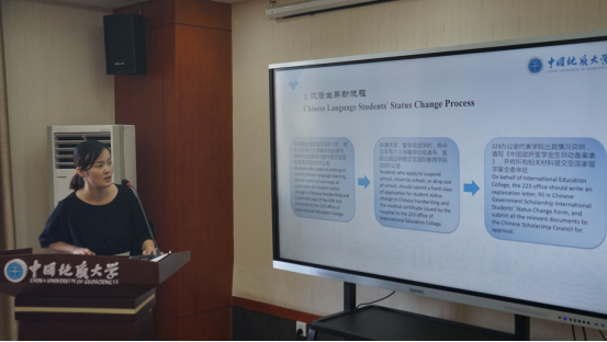 随后,国际员工招生办公室、管理办公室、教务办公室的老师们一一向国际员工新生们作自我介绍,并就公司概况、招生宣传、选课及学分、结毕业流程、预科生及语言生管理、外国人签证、职工保险、奖学金生年度评审、员工组织及活动、新老生线上注册等国际员工重点关注的话题进行入学教育说明会。