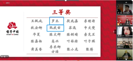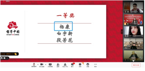 公司阿富汗籍杨康斩获一等奖;赤道几内亚籍罗木、越南籍阮庆玄获三等奖;柬埔寨籍龚少杰获得优秀奖,指导老师为对外汉语教师殷思琴。获奖同学在不同国家和地区参加了云典礼。