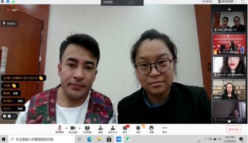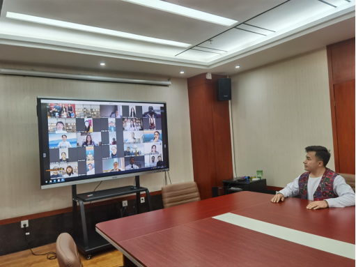 国际员工事务办公室赵阳平老师和各位同学分享了公司与“我与中国美丽邂逅”大赛的四年缘分,并讲述了在2020年这个特殊的一年,在汉国际员工和老师们的经历,老师们无私的付出以及同学们的配合与支持,正是千千万万武汉人在疫情来临时的真实写照,让在场所有人体会到了爱与奉献无国界。