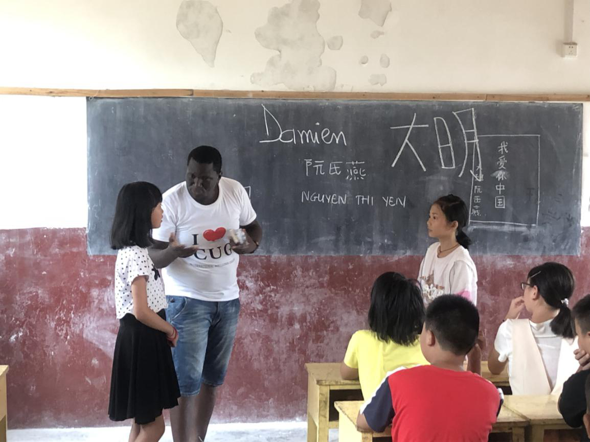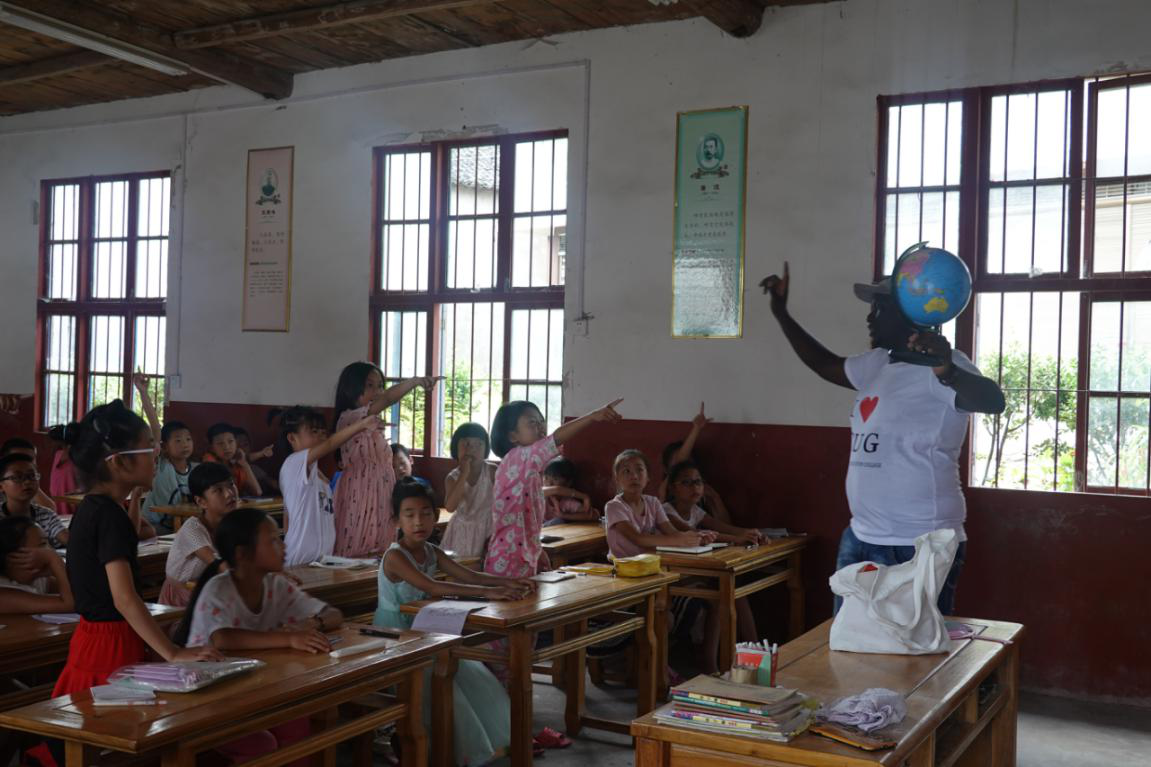 因热爱中国文化,六年前大明离开非洲贝宁到地大留学,不仅提高了专业知识,还了解到了中国的文化,学习了中国语言,结交了许多中国朋友。学习期间,得到了许多老师们和中国朋友的帮助,大明非常感恩这段留学经历,他带着感恩的心情参加此次志愿活动,希望通过自己的努力帮助到更多有需要的人。大明教授的课程为《我从非洲来》,他多变的课堂风格吸引着孩子们和在窗外等候孩子放学的爷爷奶奶们。大明转动地球仪告诉孩子们,世界很大,中国在这里,非洲在这里,他的家乡在那里。