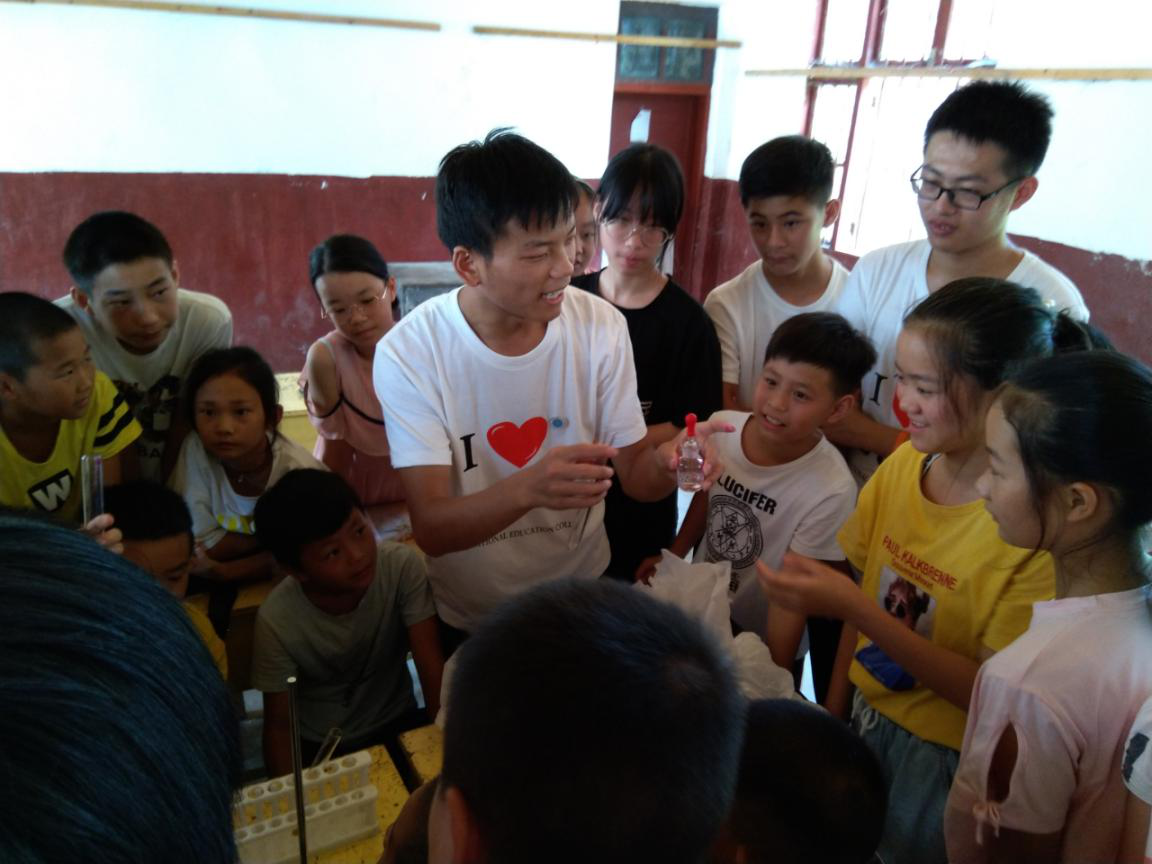 应用化学专业本科生杨文强是校墨彩丝路志愿团团长,也是丝路志愿队的队长,他2017年以来共参加志愿活动时长271小时,组织志愿活动54次,参与志愿活动87次。地球物理专业本科生崔宇昊也是灵韵笛箫协会箫组组长,此次活动他们一起教授《身边的化学》。课堂上,两位老师用图片和故事给大家讲解了什么是生活中的化学,积极引导孩子们思考并提问,化学指示剂变色实验引起了孩子们的极大兴趣和注意力,看到孩子们好奇专注的眼神两位老师觉得自己的付出都是值得的。