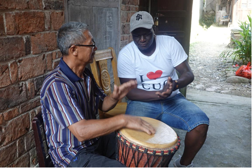 图4 大明和寄宿家庭爷爷交流非洲鼓