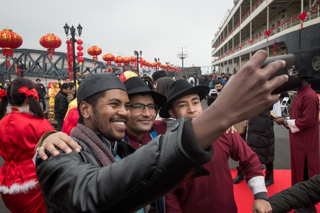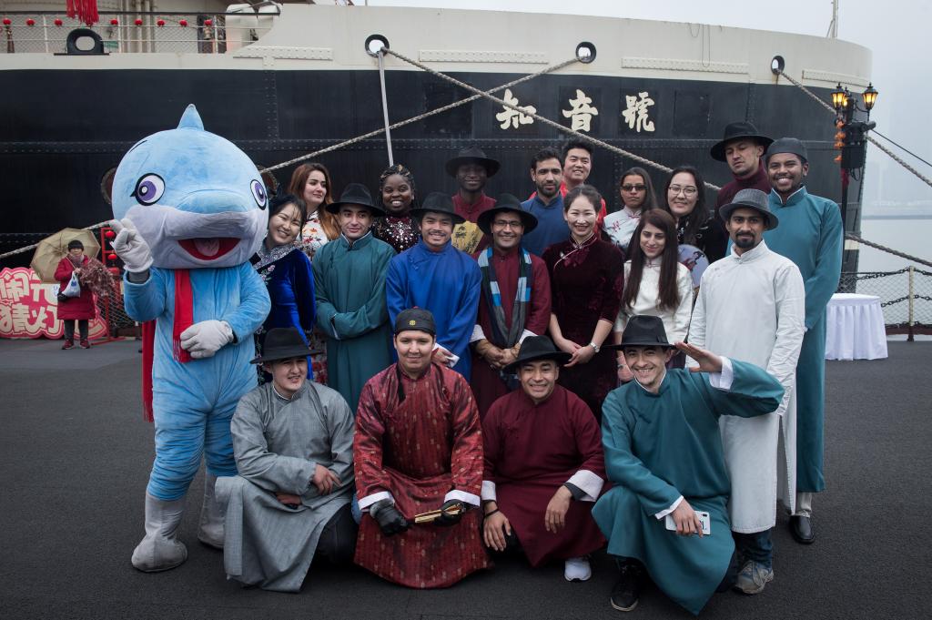 《知音号》还迎来了一批特别观众。“一带一路”沿线国家来华职工——beat365官网中文版本丝绸之路公司的30余名职工,在元宵民俗文化节上体验了一把包汤圆、猜灯谜的民俗活动后。当晚,大家集体换装,穿上马褂、旗袍,兴致勃勃地登船观演。