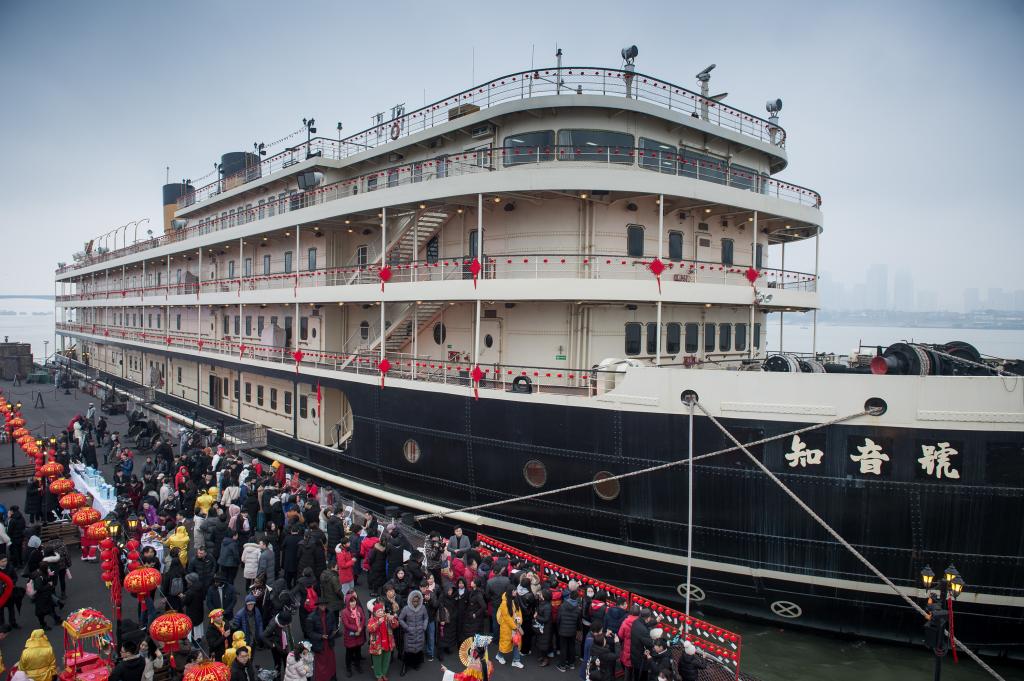 华中师范大学员工尹文静和几个同学拿起手机不停拍照,她说,“在‘知音号’上逛元宵民俗文化节,穿越百年时光,感受汉味年俗的韵味,还能欣赏长江夜景,这种混搭既时尚又新颖。今年军运会在武汉举行,期待这次国际体育盛会。”