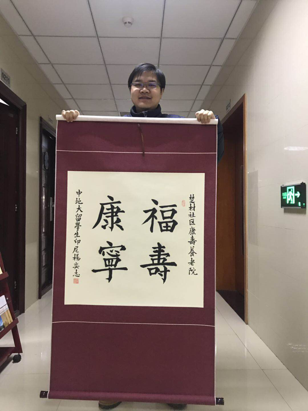 下午3时许,由6名国际员工和3名中国员工组成的志愿队来到了楚材社区康寿养老院。首先,马来西亚籍员工杨奕志向养老院经理赠送了自己的书法作品《福寿康宁》,受到了经理和在场老人们的一致赞许。