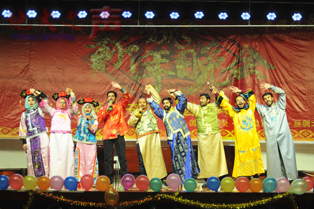 开场一首《丝路情•共建桥》使整个晚会沸腾起来,热情的非洲鼓敲出浓浓的年味儿,激情的说唱更展示了职工们深深的武汉情、中国梦,最后一句“我爱中国”更是唱出职工的心声。蒙古舞《天空的旋律》跳出了蒙古汉子的柔情,舞出了蒙古姑娘的甜美。欧亚非三个洲别的员工用三句半讲述了他们的《职工活》,表达了职工们对地大的深情厚爱。来自泰国的情歌王子张明诚和他的小伙伴们,给大家带来了歌舞情景剧《把汉语唱给你听》,最后的歌词改编更是把汉语学习生活表达的淋漓尽致,将现场气氛推向高潮,现场掌声不断。晚会在合唱《国家》中圆满落幕。