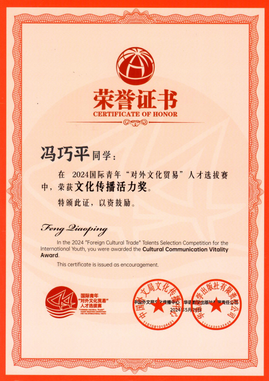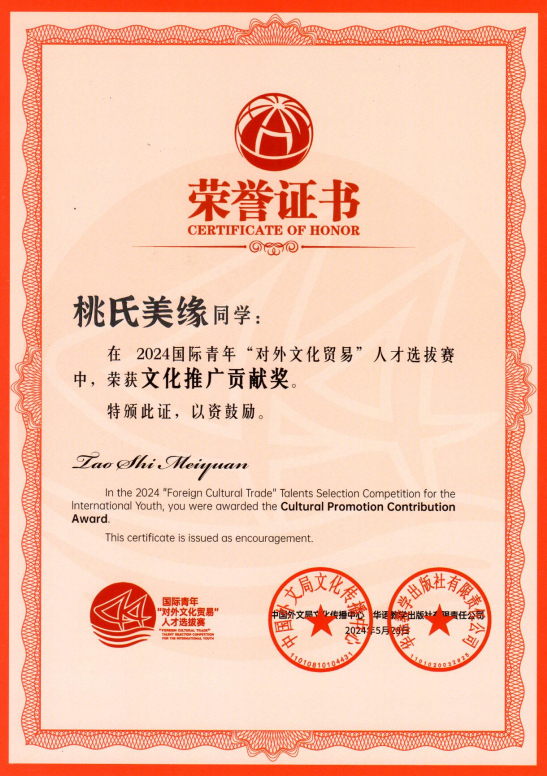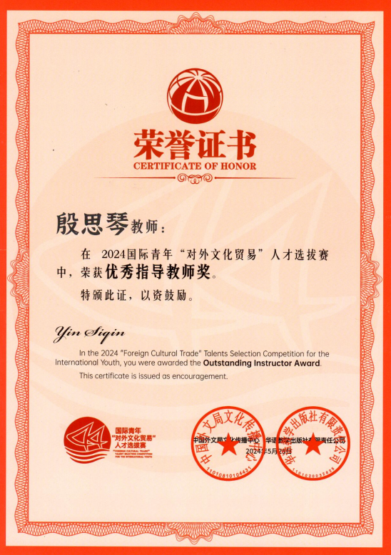 近日,由中国外文局文化传播中心和华语教学出版社联合主办的2024国际青年“对外文化贸易”人才选拔赛公布获奖名单,公司国际员工在此次大赛中表现优异,斩获多个奖项。beat365官网中文版本荣获“院校优秀组织奖”,越南籍国际员工桃氏美缘荣获“文化推广贡献奖”,印度尼西亚藉国际员工冯巧平荣获“文化传播活力奖”,美国籍国际员工陈婉淇荣获“文化传播活力奖”,beat365官网中文版本殷思琴老师荣获“优秀指导教师奖”。